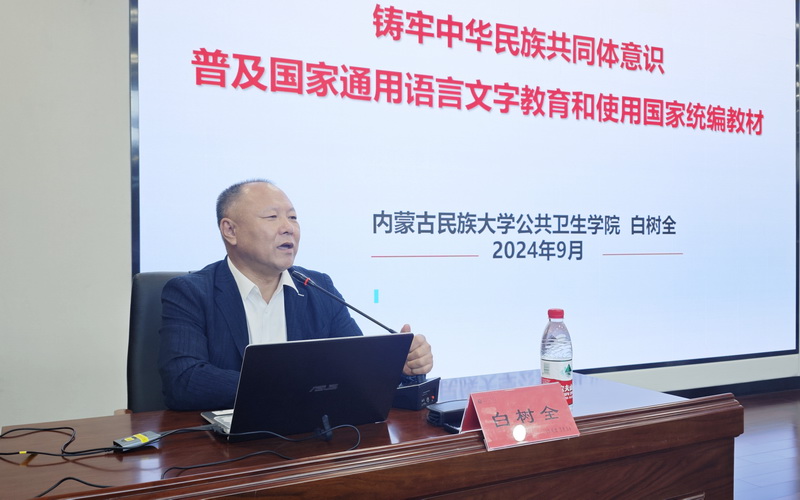 白树全以《铸牢中华民族共同体意识 普及使用国家通用语言文字和国家统编教材》为题,从如何全面准确理解中华民族共同体意识入手,围绕各民族共同开拓的辽阔疆域、各民族共同书写的悠久历史、各民族共同创造的灿烂文化、各民族共同培育的伟大精神等内容,详细梳理和分析我国统一的多民族国家发展的历程,深刻解读了“中华民族共同体”理论内涵和推进国家通用语言文字教育的重要意义。白树全要求同学们在学习和生活中要提高政治站位,深入落实习近平总书记交给内蒙古的五大任务和全方位建设“模范自治区”两件大事,更好地担负起新的文化使命。