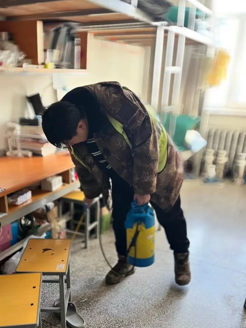 消杀人员严格按照卫生消毒管理规范,对宿舍、卫生间、走廊等区域进行了全面细致地消杀。同时,对门窗把手、楼梯扶手等高频接触处进行重点消毒处理,确保消毒效果达到最佳。